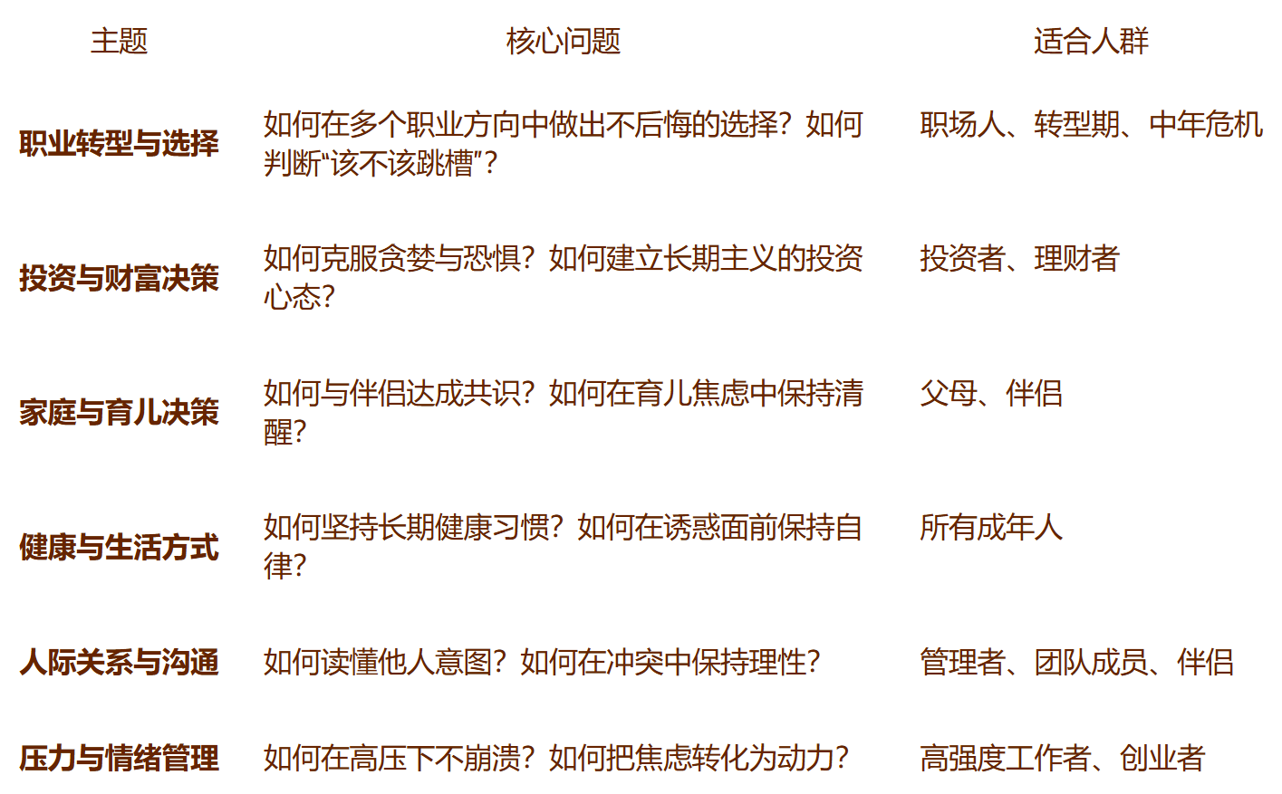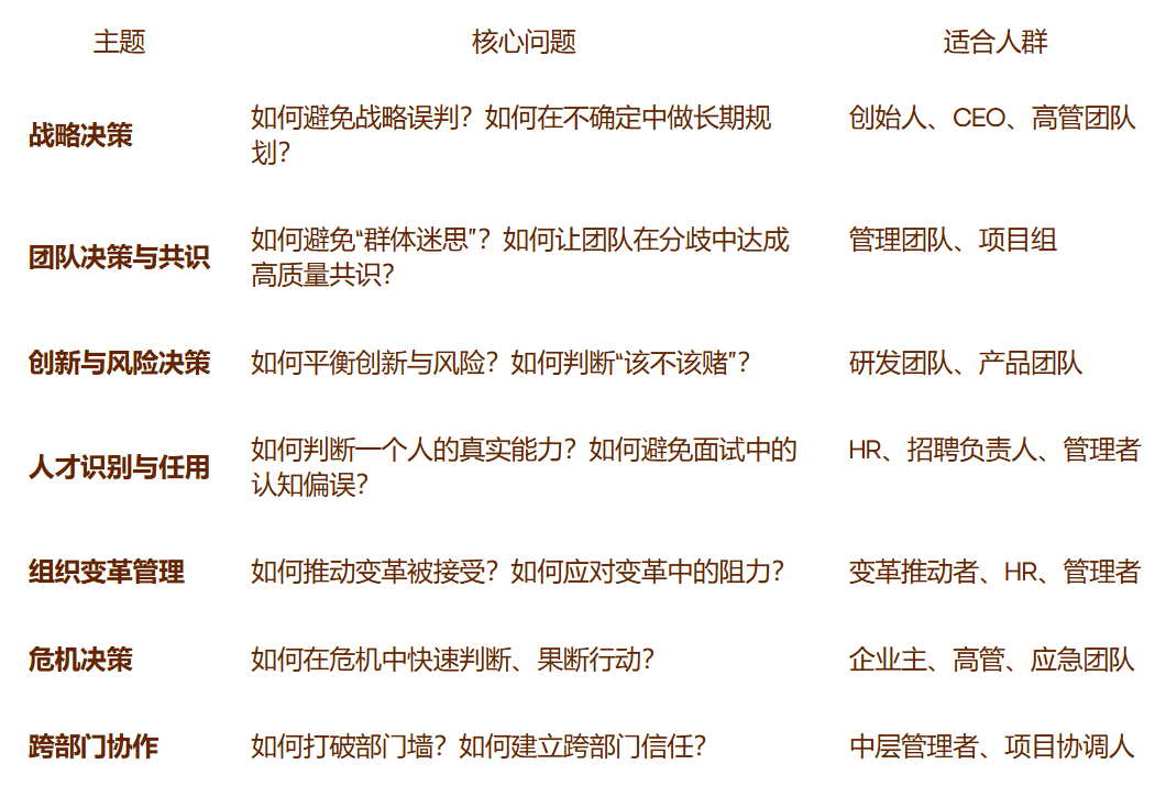 A:我们会先与企业负责人沟通,了解当前面临的具体决策挑战,然后结合我们的认知决策框架,设计针对性课程。欢迎联系我们详聊。