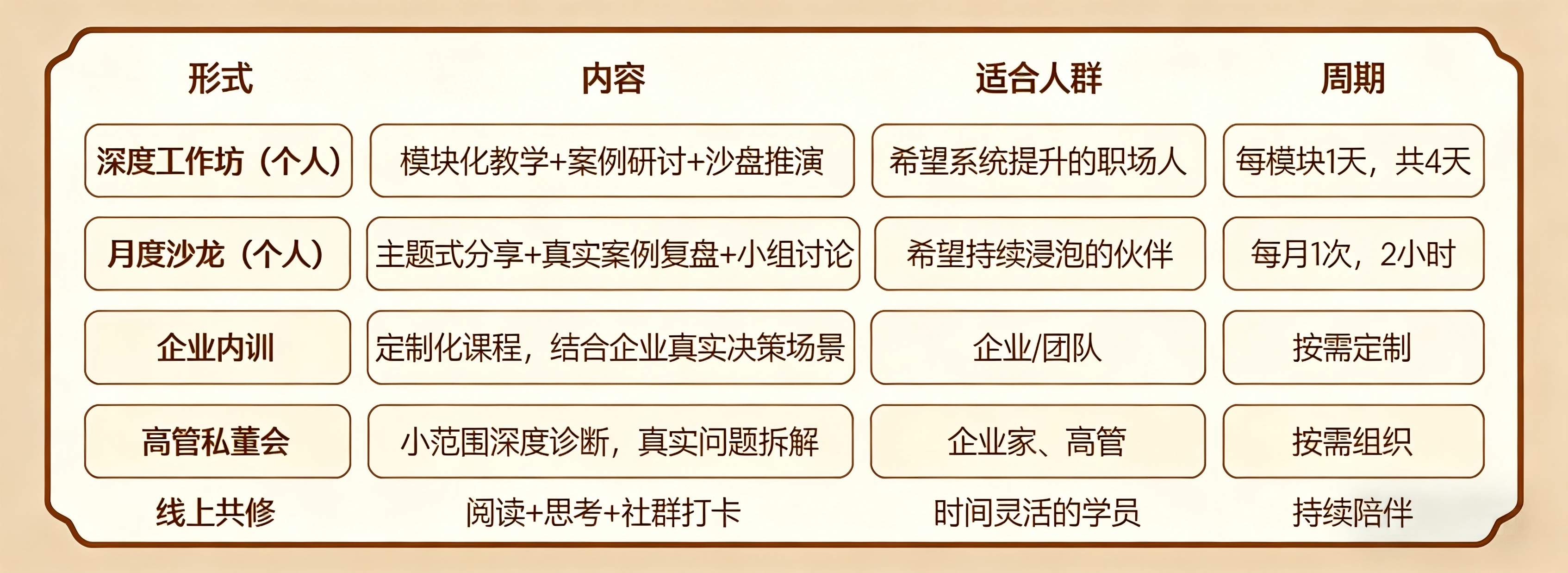 A:目前主要在线下,因为深度交流、沙盘推演需要面对面互动。企业内训可根据需求定制形式。