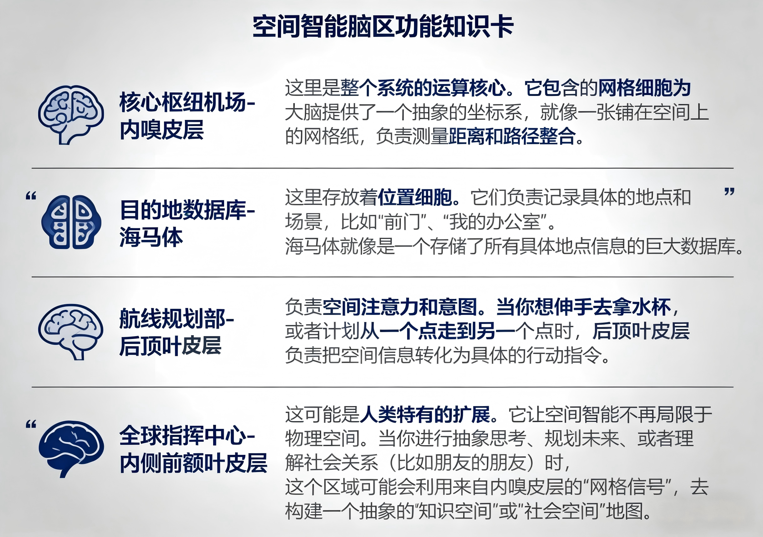 这个网络不仅让我们能在物理世界中不迷路,更可能为我们处理复杂的抽象思维提供了基础框架。