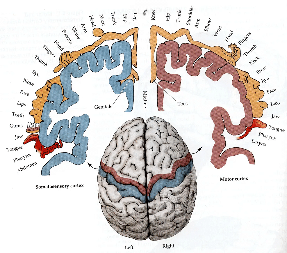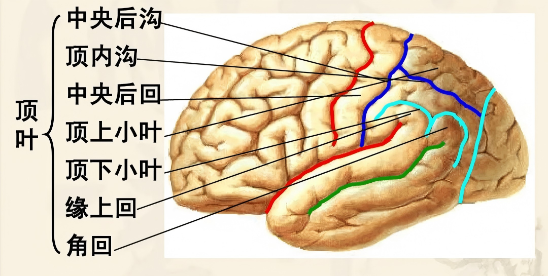 初级躯体感觉皮层:位于顶叶最前部(中央后回),负责整合触觉、痛觉、温度觉和本体感觉(即感知自己身体各部分在空间中的位置)。