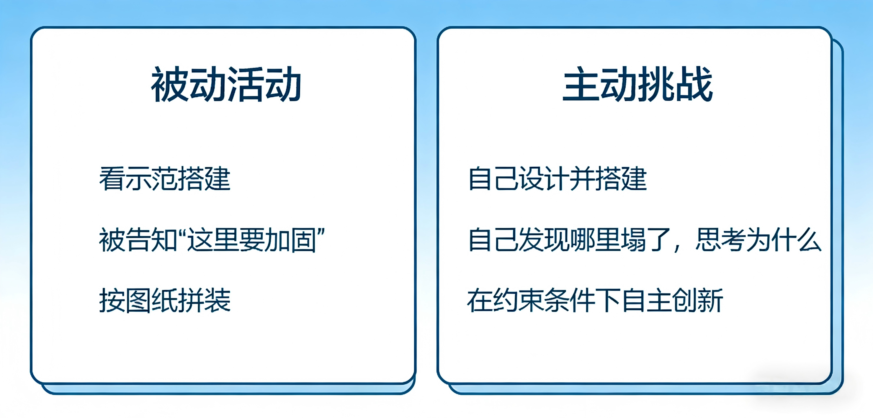 工坊应用:纸桥承重中,设计任务让孩子至少失败一次,然后在引导下从失败中学习。每一次失败后的反思,都在强化联合皮层中的因果推理回路。