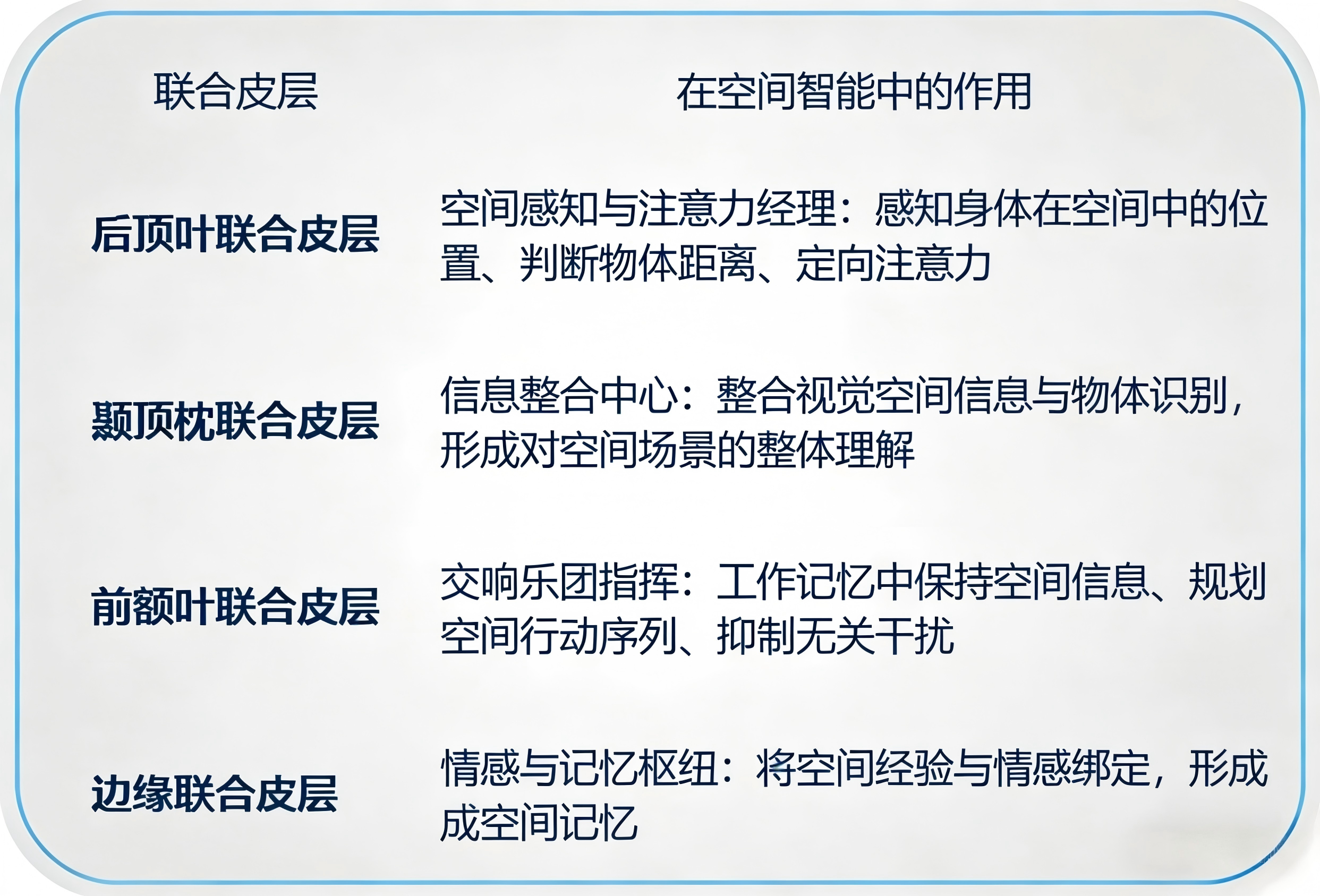 关键洞见:空间智能不是某一个脑区的“专利”,而是整个联合皮层网络协同工作的产物。后顶叶提供“实时空间感知”,颞顶枕区负责“空间信息整合”,前额叶进行“空间规划与决策”,边缘系统赋予“空间记忆与情感”——四者缺一不可。