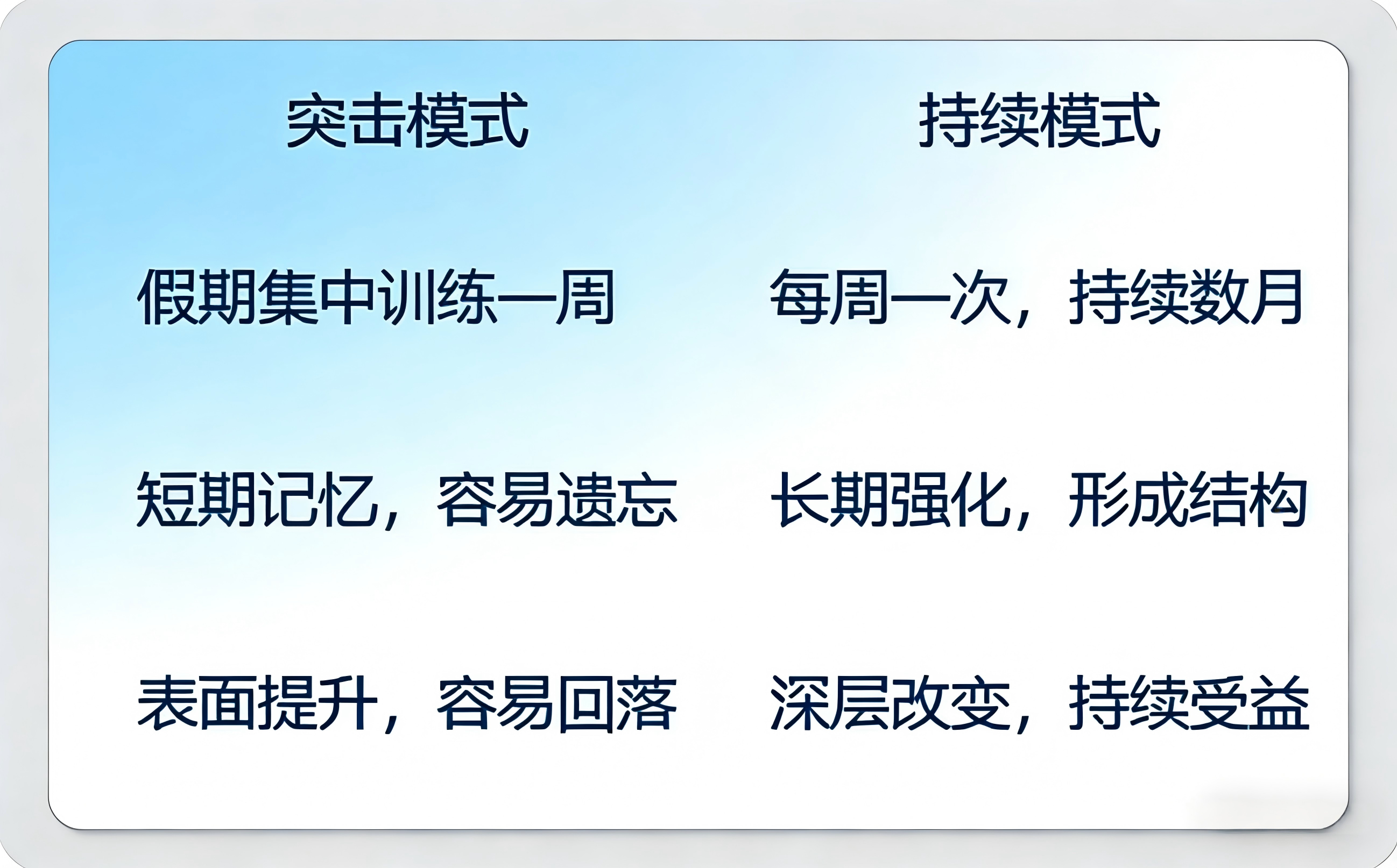 联合皮层的发育需要持续、规律的刺激,而不是偶尔一次的高强度训练。神经连接的强化需要时间,需要反复激活。