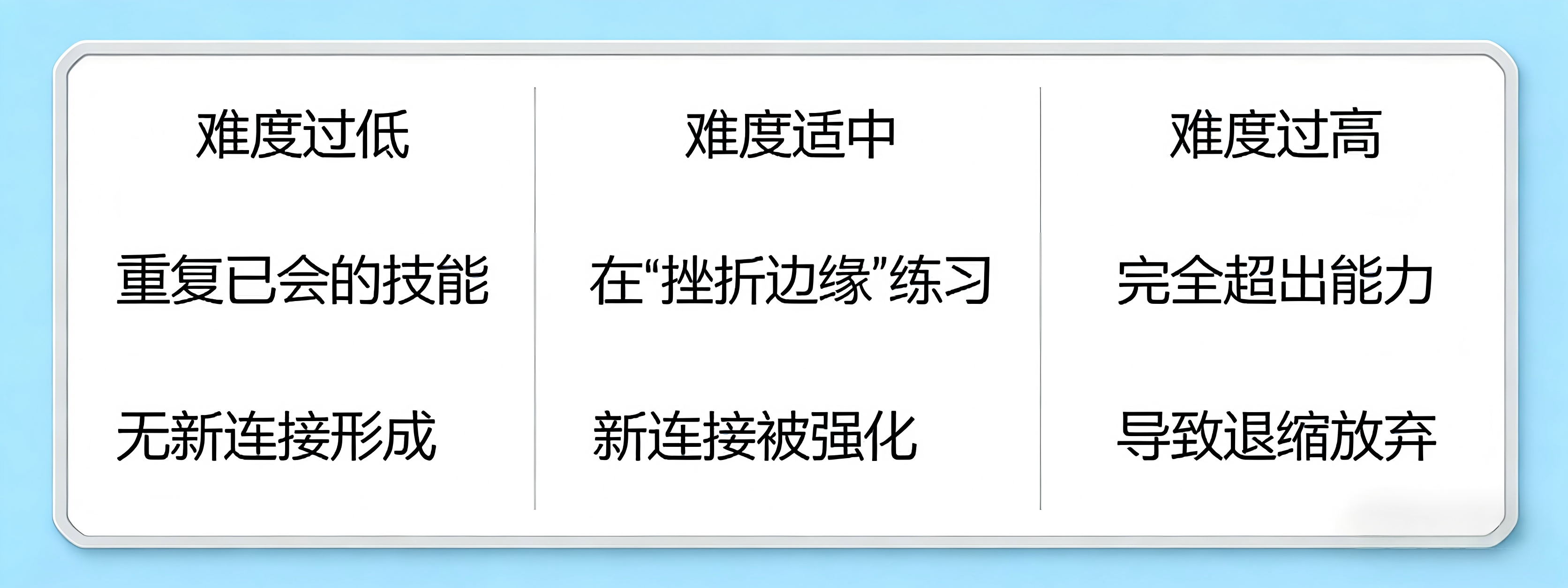 联合皮层的发育依赖“被频繁使用的连接”。这个“频繁使用”需要恰到好处的难度——太简单不触发新连接,太难导致退缩。