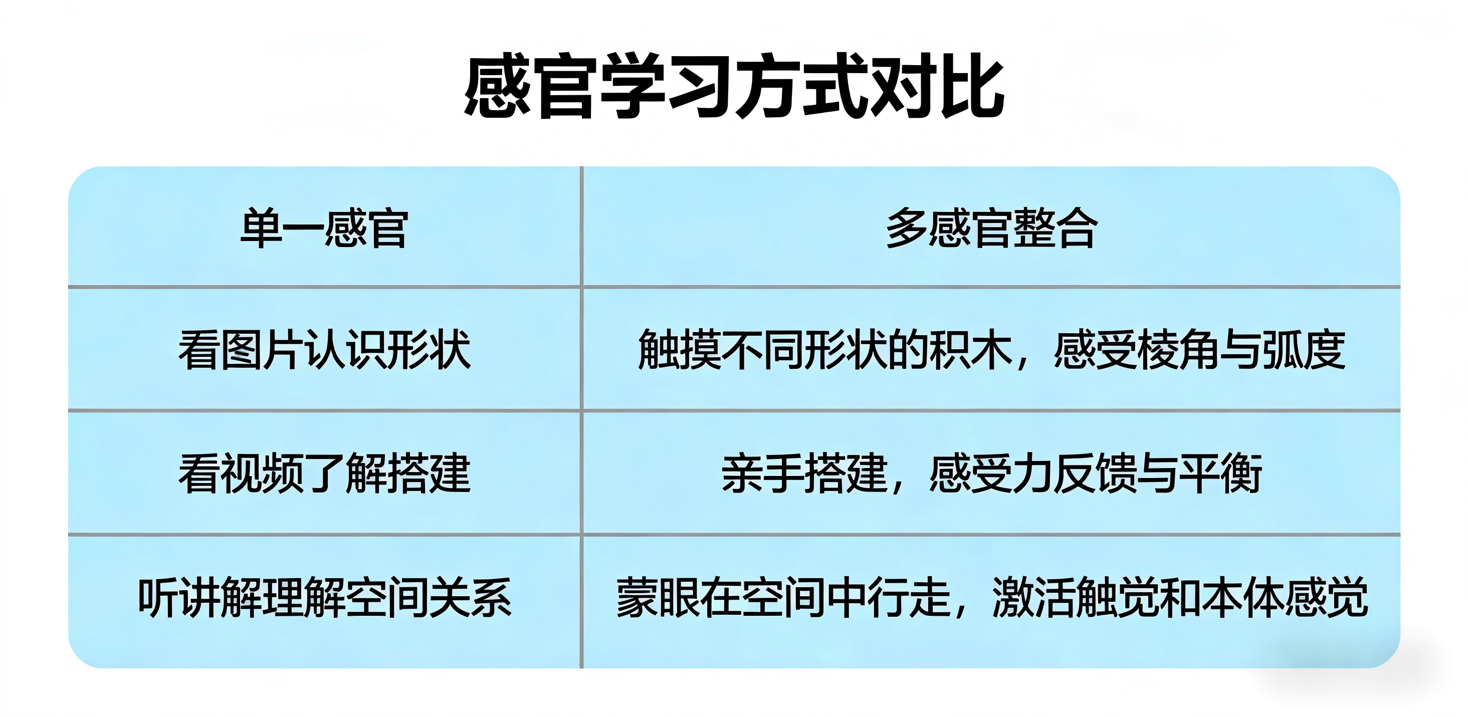 联合皮层之所以叫“联合”,就是因为它整合多种感官信息。因此,训练空间智能不能只靠“看”,必须调动多种感官: