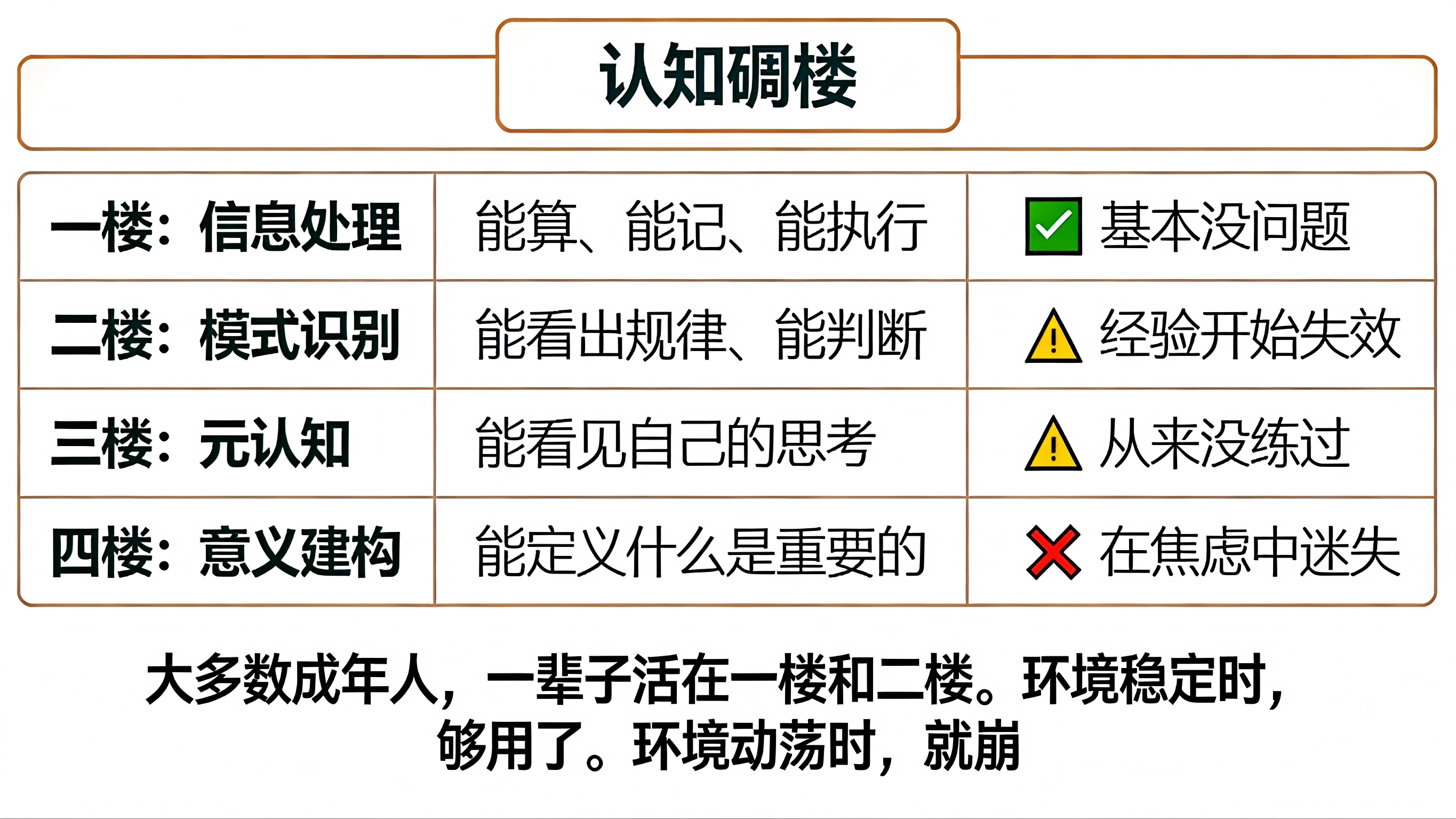 大多数成年人,一辈子活在一楼和二楼。 环境稳定时,够用了。 环境动荡时,就崩了。